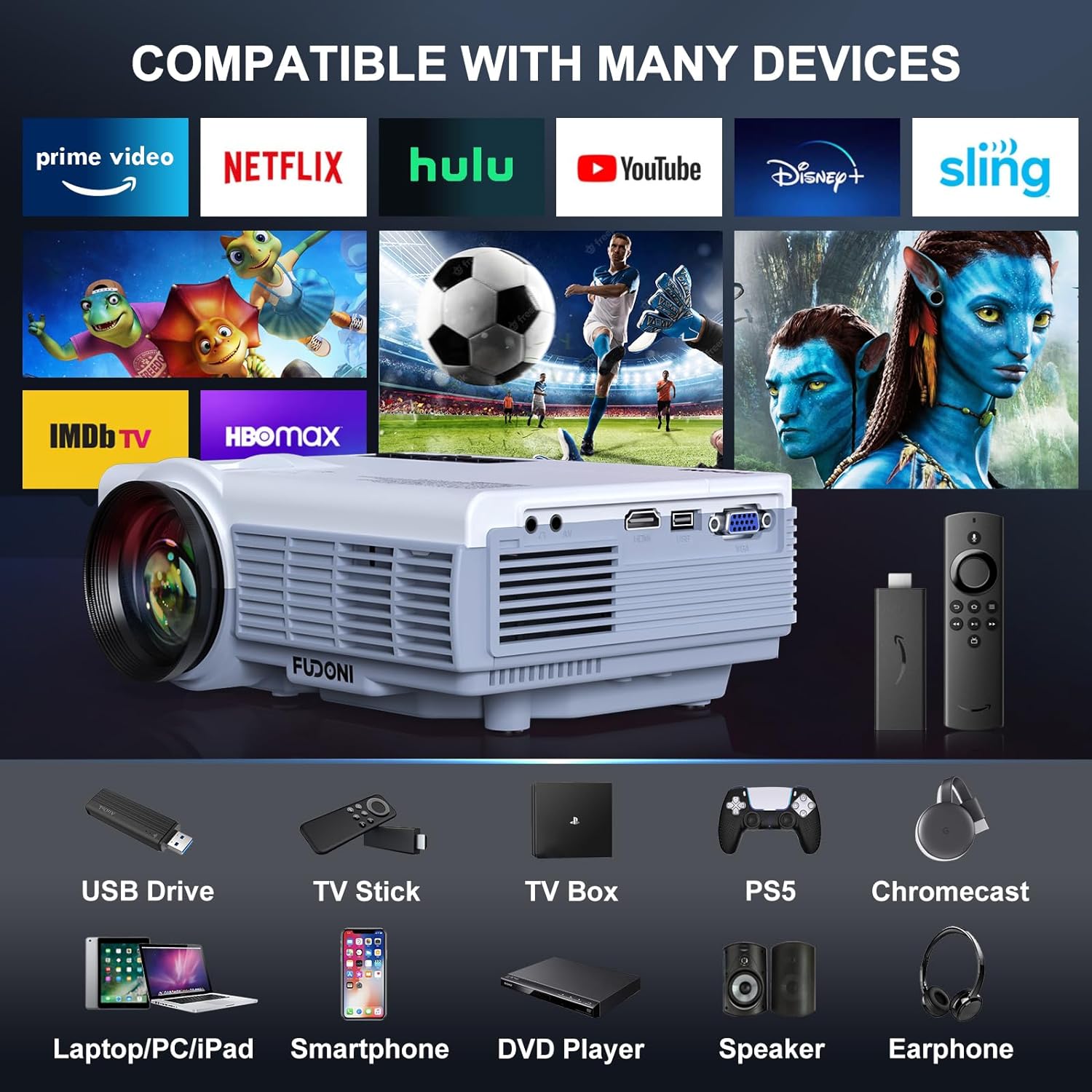 - [Multiple Interfaces and Compatibility] The WiFi projector makes your home electronic devices more dynamic and useful and it is compatible with iPhone, Android phone, Laptop, PC, Tablet, Xbox, TV Stick, Roku, Chromecast, DVD, Gaming device, USB Drive, external speaker, earphone, etc. as it contains multiple ports like USB, HDMI, VGA, Audio and AV ports.